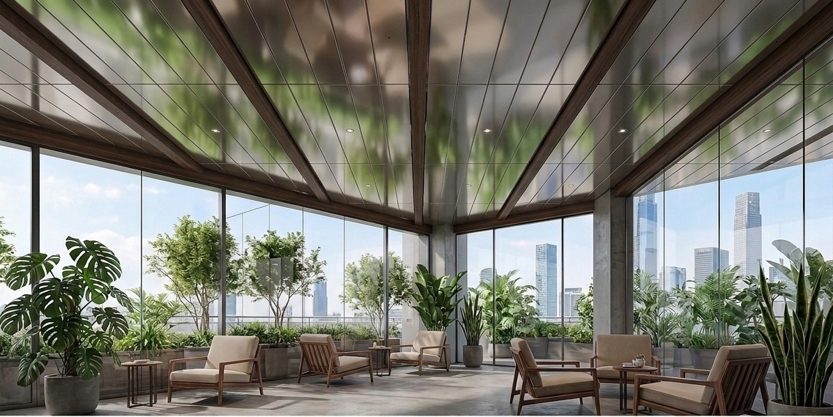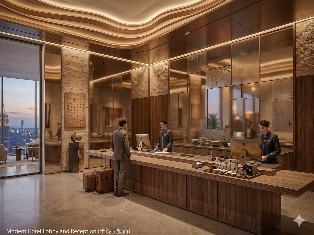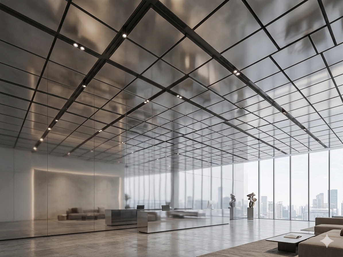 鏡面のように強く映り込むのではなく、空間にやわらかく溶け込む上品な反射が特長です。