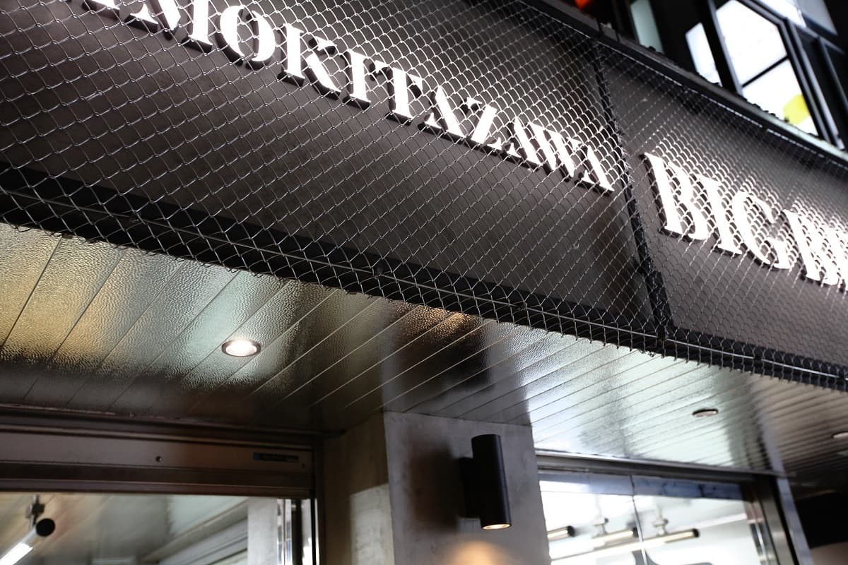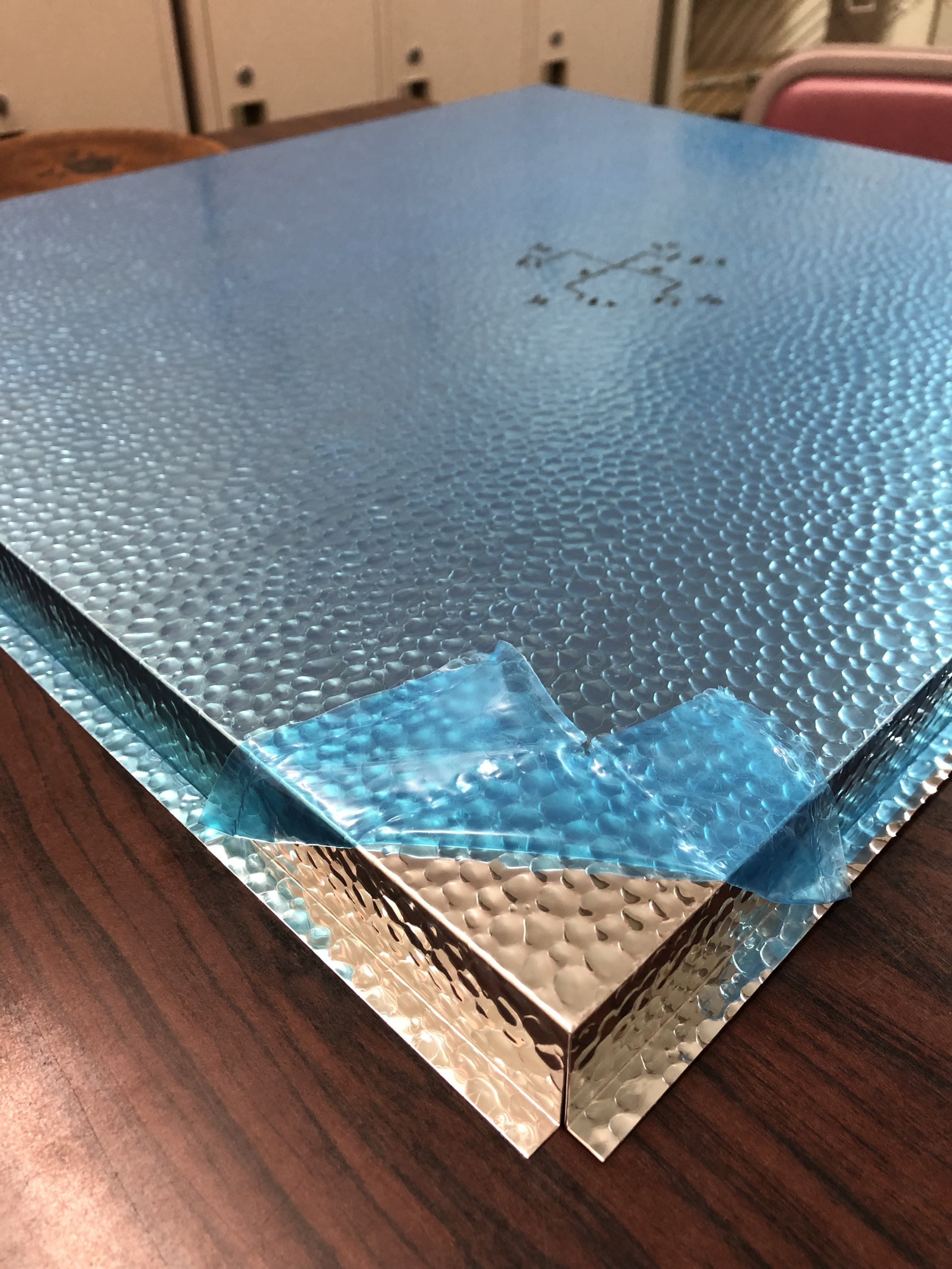 0.5mm厚の極薄アルミ板に槌目加工を施したハンマートーンは、ステンレスに比べて約1/3の重量。軽量なため、壁紙のように両面テープや接着剤で施工されるケースもあります。