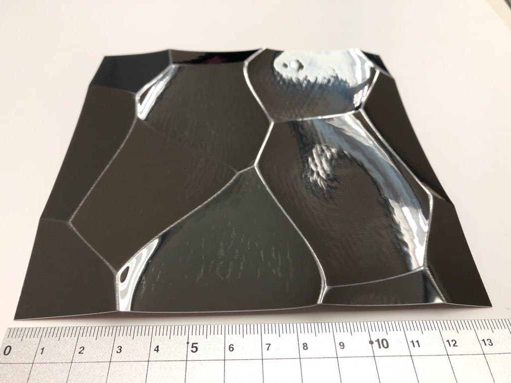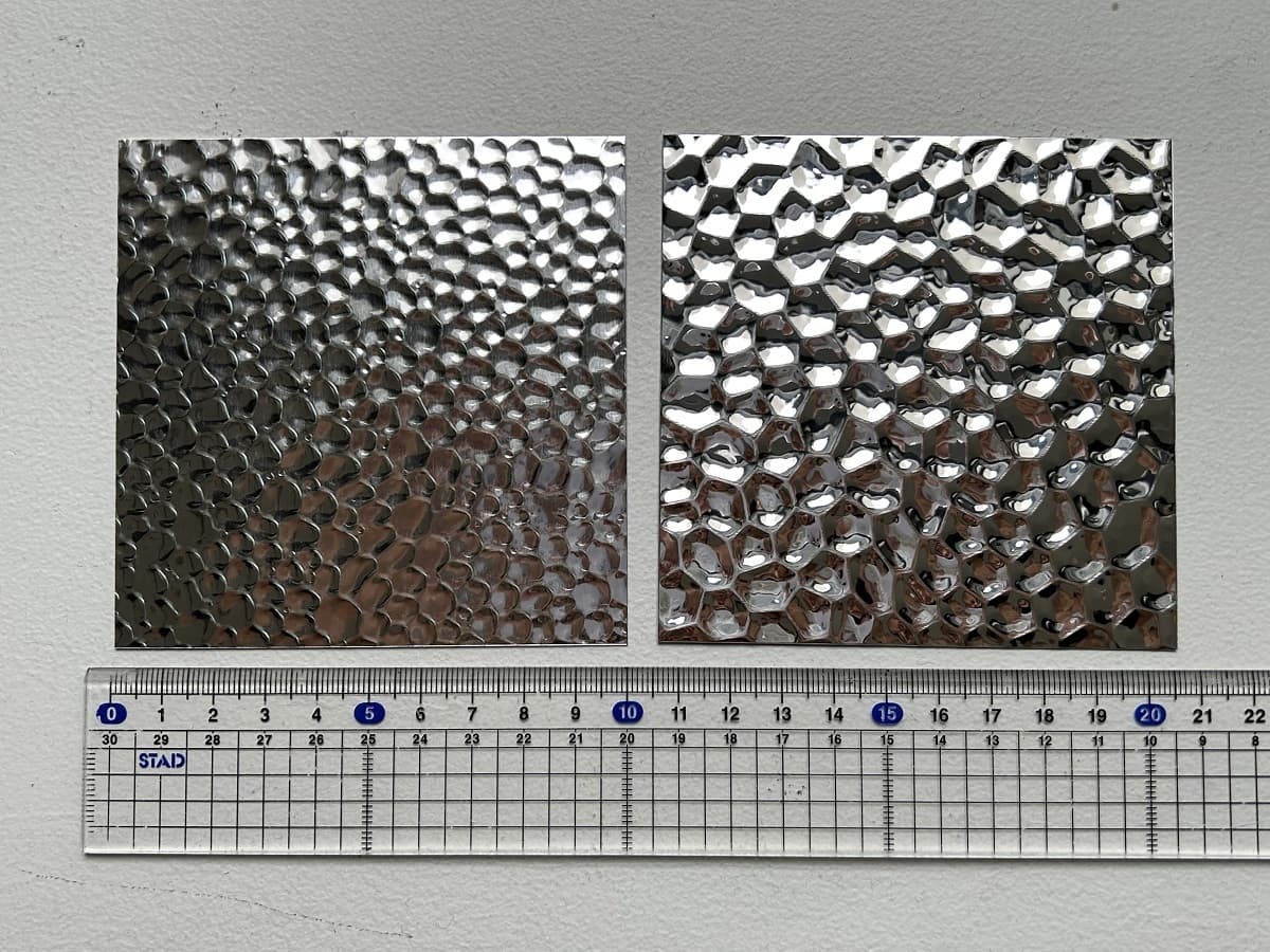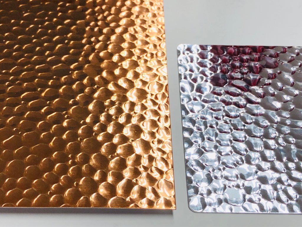 ハンマートーンは、鏡面仕上げに槌目模様を施した光沢感のある意匠材です。表面には反射性がありますが、鏡のように顔が映るほどではなく、柔らかな輝きを放ちます。