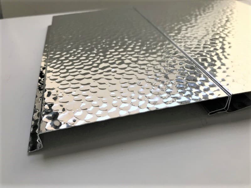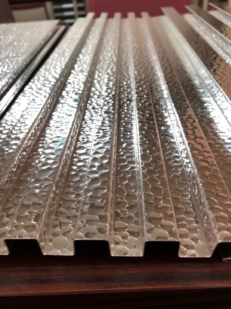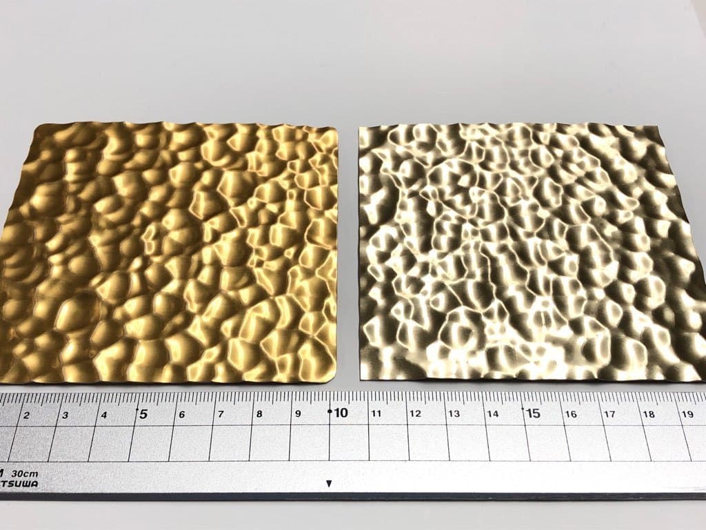 当社が取り扱うハンマートーンは、99.85%の高純度アルミに電解研磨+連続コイルアルマイト処理を施した高品質な意匠材です。表面処理により、耐腐食性・耐指紋性・美しい光沢を兼ね備えており、内装仕上げ材として高い評価を得ています。