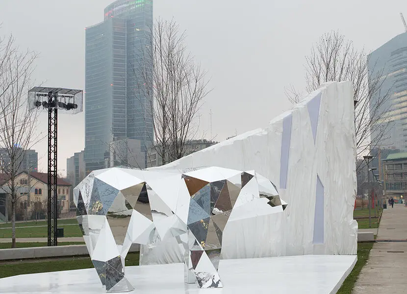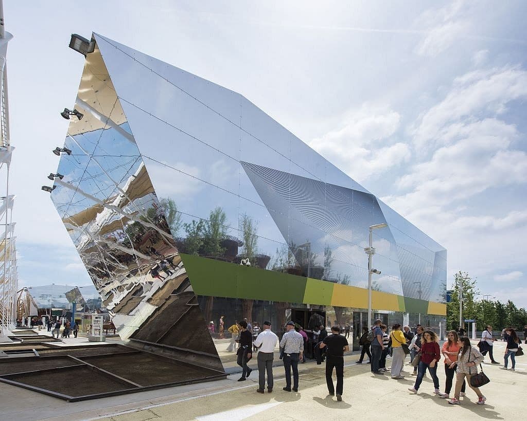 右の写真は、実際に屋外で施工された事例。軽量で加工しやすく、耐久性にも優れたアルミ鏡面板は、今後の建材選びに新たな選択肢を提供します。