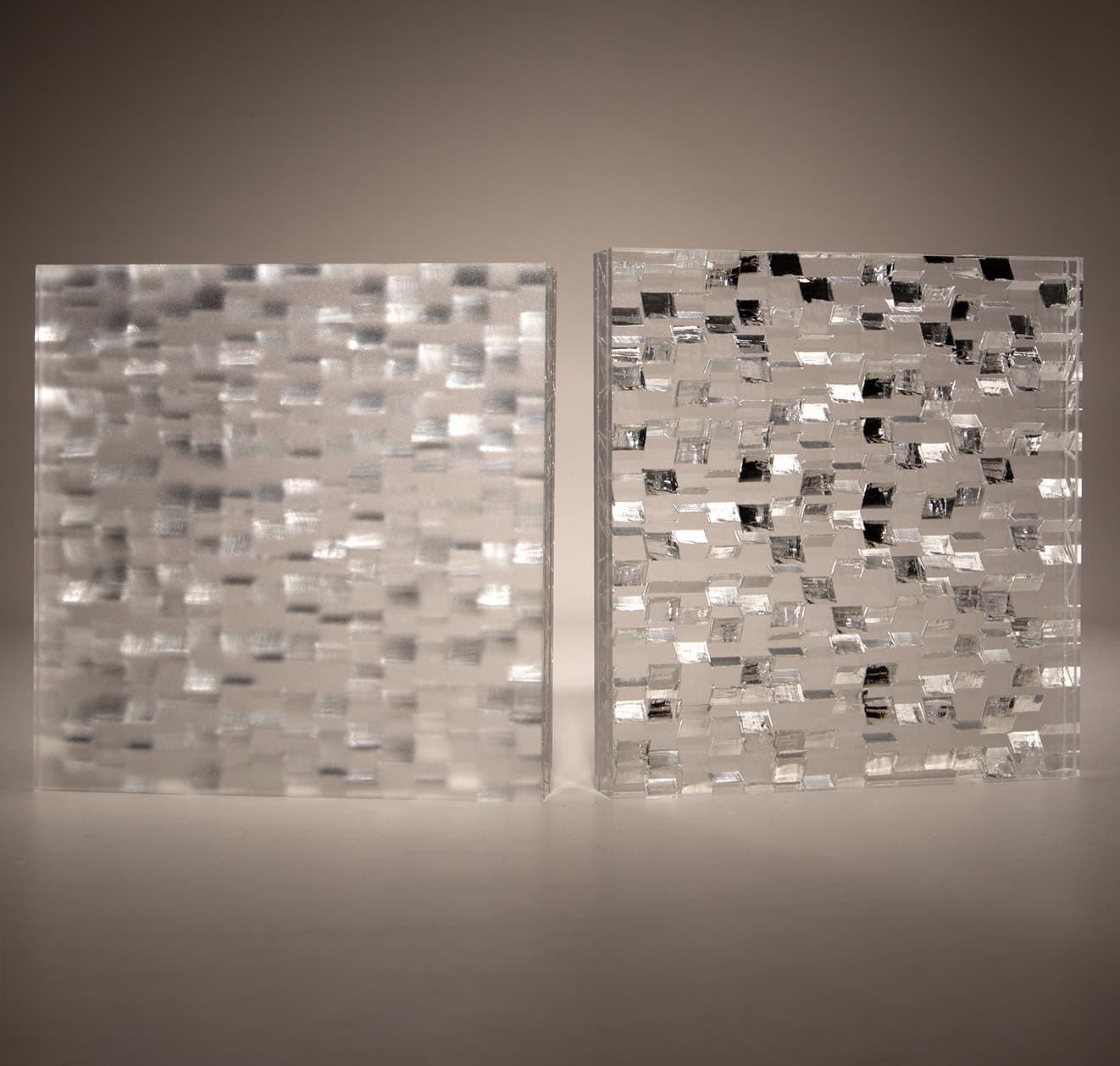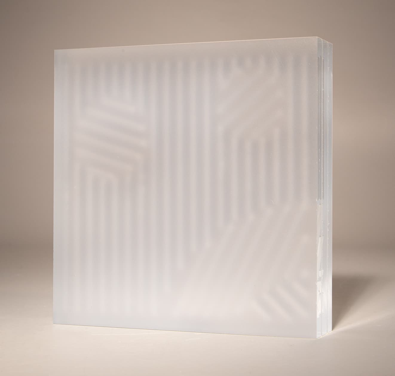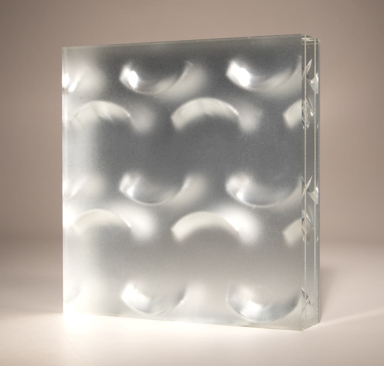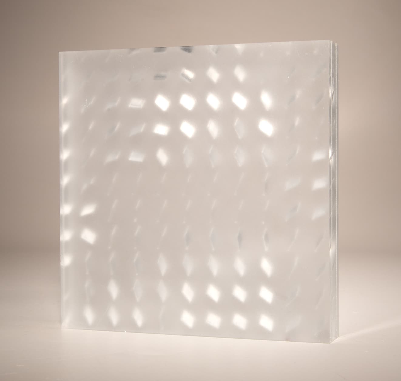 豊富な内部ファセット(模様)と中間膜が滑らかな合わせガラスに挟まれています。表面強度がアップされ、屋外にも対応可能です。