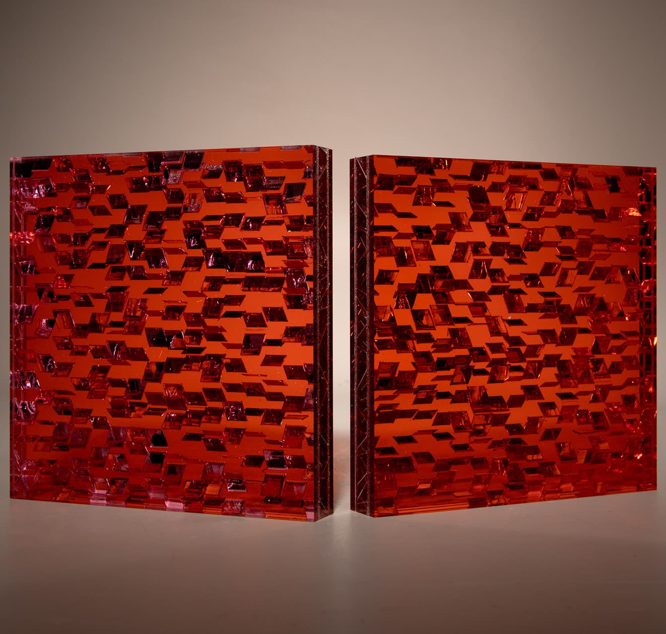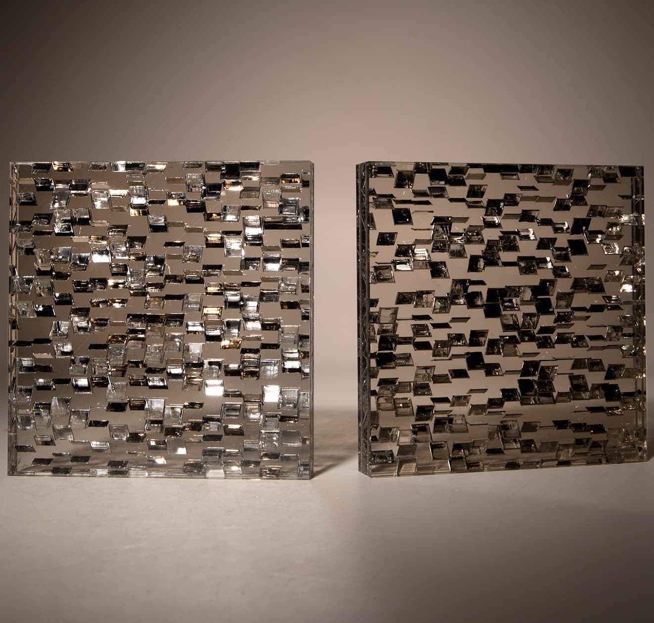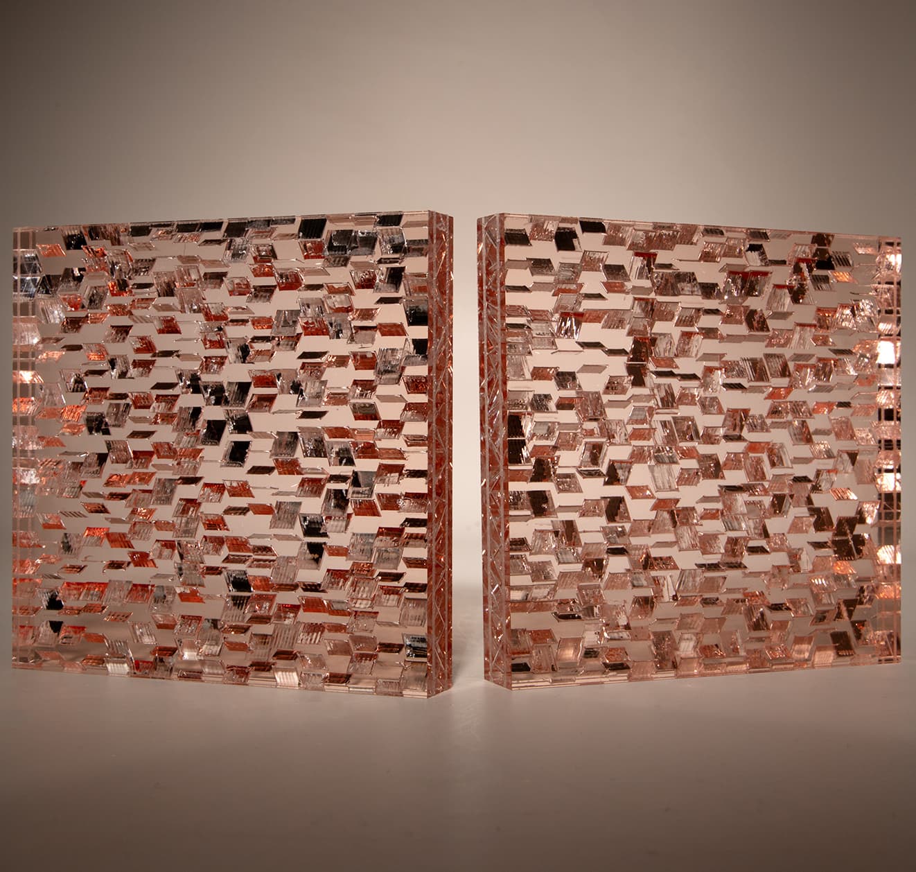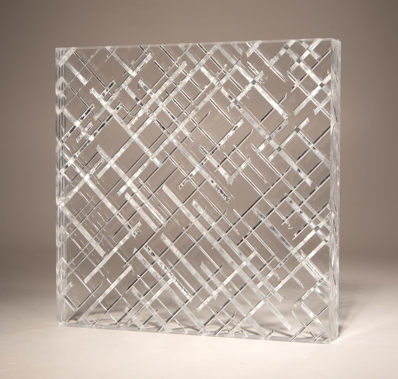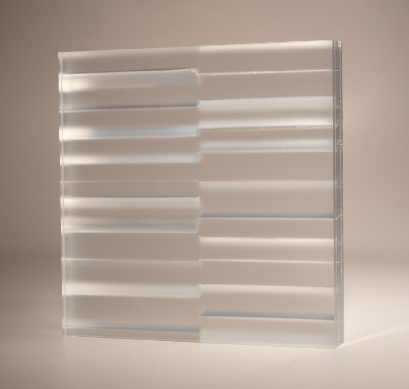豊富な内部ファセット(模様)と中間膜が滑らかな合わせガラスに挟まれています。表面強度がアップされ、屋外にも対応可能です。